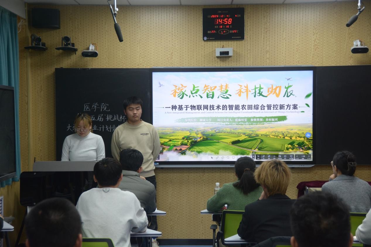 本次院赛聚焦“医疗健康+科技赋能”主题,8支参赛团队带着精心打磨的科创项目登台竞技,各展所长、亮点频出。各小组项目立足社会现实需求,覆盖农业发展、医疗服务、校园建设、绿色消费等多个领域,精确定位各领域的实际痛点与发展难点,将物联网、人工智能、深度学习、新材料研发等前沿技术与医学专业特色深度融合,给出一批兼具实用性与创新性的优质方案。从用智能技术为农田管理提质增效的乡村振兴方案,到依托AI技术优化骨龄评估、基层诊疗的医疗创新项目;从打造“小程序+社群”模式的居家康复服务体系,到构建“能耗可视化+行为引导”的零碳校园平台,每一个项目都彰显着学生们将专业知识与科创实践结合的巧思,也体现出他们关注社会、解决实际问题的责任与担当。答辩环节中,评委围绕项目可行性、市场竞争力等关键维度精准发问,与同学们展开深度的讨论,点评犀利深刻,并给予同学们针对性的建议;参赛选手应答逻辑清晰、从容有度,现场互动氛围热烈融洽。