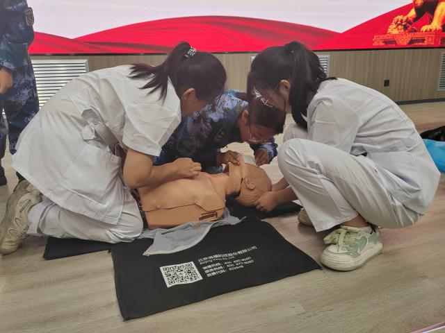 立其身而立其国,授之技以授之志。军训如火如荼地进行,训练科目不断丰富,战地医疗救护理论与基本技能培训科目成为面向全校的重要课程。培训现场,“医”心向阳志愿服务队成员使用模拟人为同学们进行理论讲解与实际操作,向大家生动形象的展示心肺复苏的重要步骤。新生们聚精会神,积极响应服务队成员的展示工作与实践号召,有序上台进行实操。服务队成员们在一旁细心纠正同学们出现的问题,并针对易错内容进行总结并重点学习。同学们基本了解了应急救护知识,提高了应对突发灾难和意外伤害的自救与互救能力。