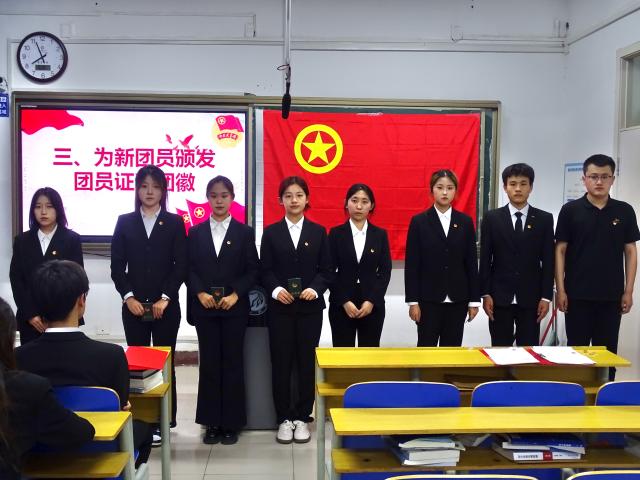 仪式在庄严的国歌声中拉开帷幕。主持人孔一鸣宣布新团员名单,随后冯昌顺为新团员颁发象征着共青团员身份的团员证和团徽。在领誓人孔一鸣的带领下,新团员们高举右拳,庄严宣誓,他们以赤诚之心许下对共青团的庄严承诺,立志为共青团事业贡献力量。入团介绍人代表呼树青宣读《团章》相关内容,让新团员们对共青团的章程和使命有了更深刻的认识。新团员代表庞亚琪发言,表达了初入共青团的自豪与对未来在团组织中积极进取的决心;老团员代表唐慧丹分享自己在共青团的成长经历,鼓励新老团员共同奋勇前行 。最后,冯昌顺进行讲话,他指出这份光荣的身份,承载着党和人民的殷切期望,意味着同学们日后要有更坚定的信念,用更严格的标准来约束自己,在实现中华民族伟大复兴的征程中,让青春在不懈奋斗中绽放绚丽之花。在激昂的团歌声中,入团仪式圆满结束。