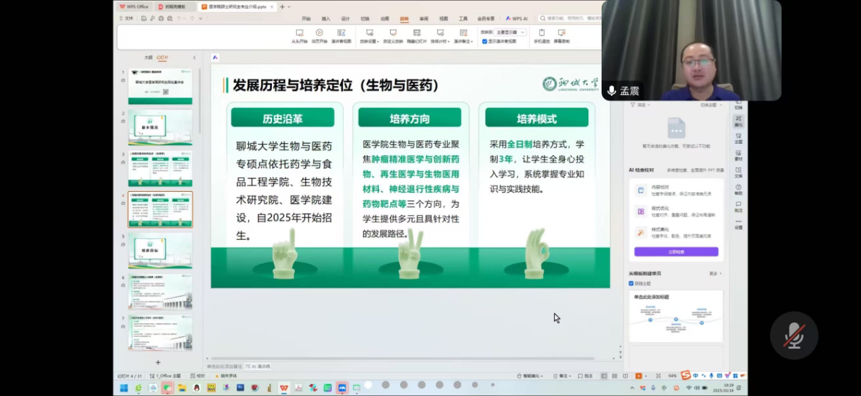 孟震围绕英国正版365首页研究生培养工作展开介绍,详细讲解了生物学、生物与医药专业的发展历程与培养定位。随后,孟震深入阐述了英国正版365首页高层次应用型人才培养目标,对于生物学与生物与医药专业,着重培养学生良好学术素养和学术道德,使其具备严谨的科学精神、独立的思考和动手能力,能利用生物学知识解决基础医学或科学问题,毕业生可在医疗机构、生物科技公司、生物制药公司等从事相关基础研究和临床转化研究工作。同时,孟震老师还展示了学院强大的导师队伍与科研实力。学院现有导师17人,其中教授8人、副教授4人,泰山学者等省级人才工程5人。近五年,导师团队承担课题40余项,出版著作3部,发表论文200余篇,获科技奖项10余项。