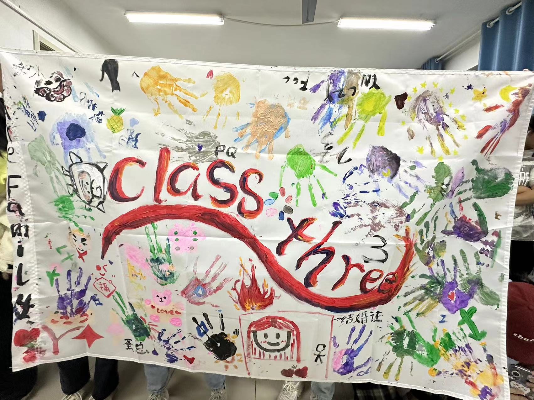 活动开始前,班委们准备颜料、画笔、画布等绘画材料,进行活动现场布置,确保活动顺利进行。活动过程中,同学们结合本次活动的主题,运用不同图案与颜色之间的相互融合描绘出一幅绘声绘色的班旗。独特的印泥,独特的手印,每个人的手印都留在了这一幅独特旗帜上,每个手印旁边独特的祝福话语代表着班级中的每一份子对班级的祝福和期许。大家共同创造了属于班级的独特标识,为班级增添一份独特的色彩,在这个过程中也增进了彼此的友谊。“我很高兴可以参加这一场班级团建活动,在这个活动中每个人都参与到班旗的制作中,共同创造出属于我们班集体的一面旗帜。”2023级3班一个同学表示到。