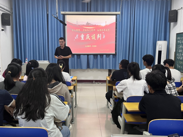 明镜所以照形,古事所以知今。观影开始之前,冯昌顺向同学们讲解了《重庆谈判》的主要内容,并鼓励同学们积极了解历史,感悟历史人物,学先辈之风范,传先辈之精神。影片《重庆谈判》主要以抗日战争胜利后的重庆为背景,通过国共两党的高层谈判,生动的再现了那个复杂多变、扣人心弦的历史时刻。在谈判桌上,毛泽东与蒋介石两位历史巨人的交锋,成为影片的核心,他们或言辞犀利,或机锋暗藏,每一个眼神、每一个动作,都透露出深邃的智慧与坚定的信念。该影片不仅讲述了历史,还暗藏着人性、智慧与勇气,在谈判过程中,国共两党的代表展现出各自的风范,他们利用各种策略,力图在谈判桌上取得最大的利益,影片中两位谈判者机智斡旋的场景使同学们历历在目,牵动着每一位同学的心弦。