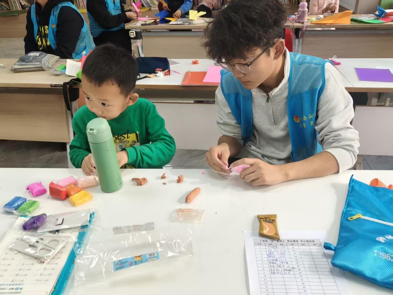 清晨的第一缕阳光刚刚落下,志愿者们便早早布置好场地,将彩纸、剪刀、胶水、彩泥等工具整齐摆放。社区的小朋友们陆陆续续到场,志愿者们首先辅导他们完成了各自作业,接着他们以趣味提问的方式引入本次手工活动主题:“大家平时见过会开花的纸吗?想不想亲手做一只会跳的纸青蛙?”简单的互动瞬间点燃小朋友们的热情,现场欢呼声此起彼伏。