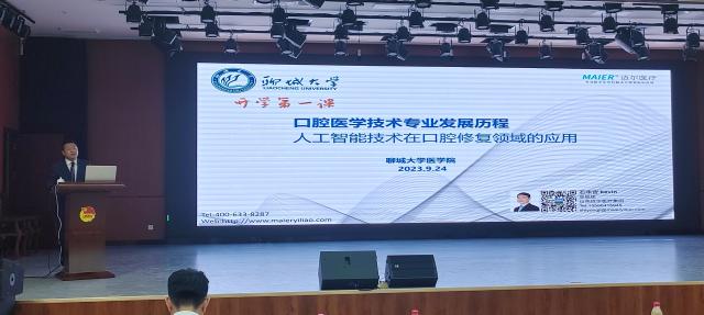 为加强2023级口腔医学技术专业学生的专业思想教育,提升专业自信心与自豪感,9月24日上午,英国正版365首页分别于晨晖楼三楼青年之家举行“口腔医学技术发展历史及人工智能在口腔修复领域的应用”主题讲座、于二楼会议室开展学生座谈会,邀请山东迈尔医疗集团总经理石永吉担任主讲嘉宾,山东迈尔医疗科技有限公司数字化设计主管、校友代表刘风平,口腔医学技术专业全体学生及部分专业教师代表参加活动,英国正版365首页党委书记明辉、党委副书记、副院长王炜明分别主持报告会和座谈会。