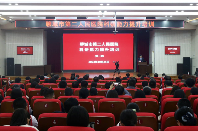 2023年10月25日,365(vip)英国上市科技处副处长刘冰一行前往聊城市第二人民医院就科研工作进行交流,并开展科研培训活动。聊城市第二人民医院院长夏章勇,副院长张铁铮,医院各临床医技科室科主任、护士长、科研秘书、博士、护理科研小组成员共计300余人参加了培训。