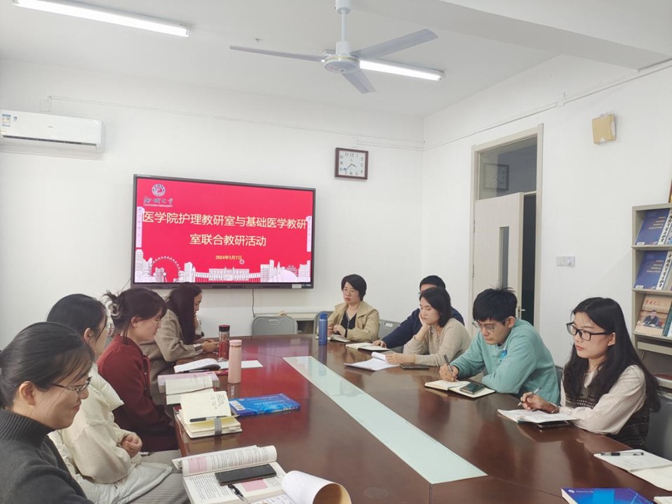 首先,杨茜茜提出此次联合教研会的主要目的:一是探讨本学期甚至是本学年护理专业课程有哪些知识点需要基础教研室支撑,以及哪些是教学重点;二是共同探讨提高课程的趣味性。任课老师分别积极发表意见,总结如下:一是本学期护理内科学教学重点涉及血液内科的骨髓穿刺、外周静脉穿刺以及神经系统的组成和动脉供应问题,需要系统解剖学相关内容作为支撑;二是关于护理内科学中心电图部分与生理学课程的心脏电生理密切相关;三是关于基础护理学中青霉素过敏性休克等重要药物过敏需要药理学基本知识支撑;四是微生物学中涉及到细菌、病毒等病原菌的内容可与护理内科学中的肺炎等感染性疾病相结合。此外,会上对生物化学、细胞生物学和微生物学的实验课实施提出了较为可行的建议:利用各类生物学玻片;简单实验器械如酒精灯、细菌培养皿等使用;有关操作视频的观看等等。会议最后,杨茜茜做出总结:此次联合会议主要是提出了较为清晰的护理学专业课对基础专业课的明确需求以及重点;同时探讨了各个相关课程的问题与改进方式。