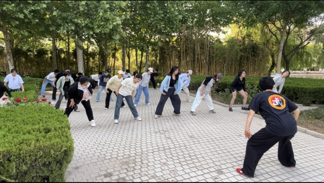 “两手托天理三焦、上托、下落……”伴随着八段锦的口令词,同学们调整呼吸,双臂缓缓抬起、微微屈膝、目光内敛。从“两手托天理三焦”到“背后七颠百病消”,每一个动作都展示出力量与美感。吴俊美亲自示范,同学们跟随动作进行练习,全身心投入其中,凝神静气,稳扎马步,一招一式,一起一伏……动作似行云流水,整齐划一、自然洒脱,同学们在一次又一次的练习中逐步掌握“八段锦”的全套技法。同时,吴俊美细致入微地阐述了其中的口诀奥秘,以深入浅出的方式传授给各位同学,在循序渐进的学习中,同学们热情高涨,个个铆足了劲,反复练习,仔细揣摩每个动作,静心感受八段锦气沉丹田、修身养心、陶冶情操的魅力。