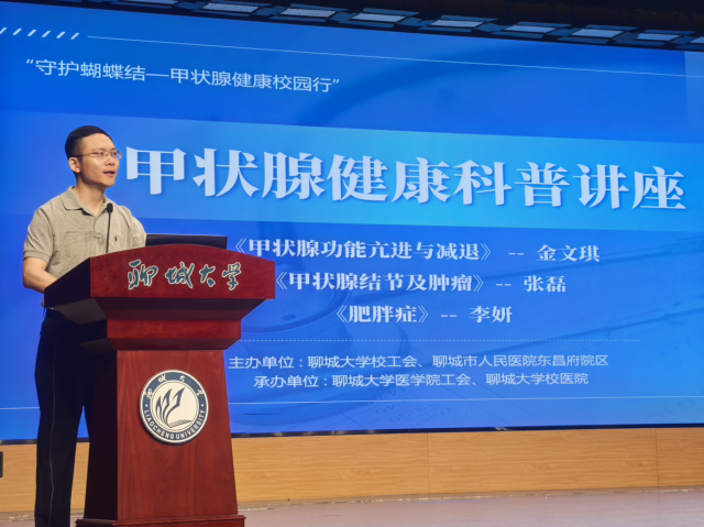 在“5·25”世界甲状腺日来临之际,为提高师生对甲状腺健康的关注度,普及甲状腺疾病防治知识,5月23日,由365(vip)英国上市校工会、聊城市人民医院东昌府院区主办,英国正版365首页工会、365(vip)英国上市校医院承办的“守护蝴蝶结,甲状腺健康校园行”科普义诊活动于365(vip)英国上市西校区报告厅举行,聊城市人民医院东昌府院区副院长李森到会并讲话,专家团队金文琪、姚鑫、印蕾作报告,英国正版365首页党委书记明辉、副教授王丽及全校师生代表参加活动。