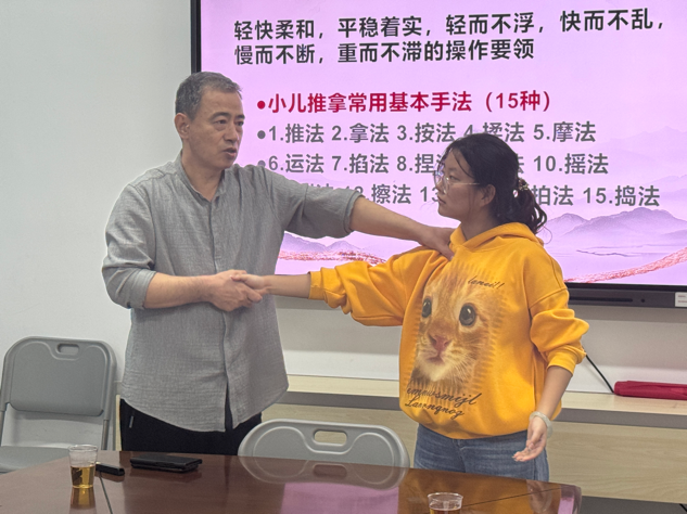 课堂上,杨磊先从中医理论出发,结合多个临床真实案例,系统阐释了小儿推拿的核心原理、适用年龄段、常见适应症及安全注意事项,让学员清晰理解“辨证施推”的重要性。理论讲解后,课程进入实操环节。杨磊首先针对推法、揉法、按法等基础手法,逐一进行标准示范,详细拆解每个动作的发力部位、角度、力度控制及操作节奏。随后,他走到学员中间,对大家的练习动作进行一对一指导:发现有学员手腕发力不当,便手把手纠正姿势;遇到穴位定位不准确的情况,就耐心标注位置并讲解记忆技巧;对动作生硬的学员,还通过对比示范指出问题所在。整个实操过程中,杨磊细致入微,及时解答学员疑问,确保每位学员都能掌握正确的动作要领,以理论与实践深度融合的教学模式,为学员打下坚实的中医实用技术基础。