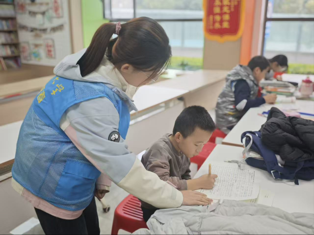 活动筹备阶段,志愿者提前梳理小朋友的周末作业,追踪学习进度,细致捕捉每个小朋友的性格特点,方便针对性辅导。在辅导作业环节,志愿者或一对一耐心拆解作业难点,或小组协作搭建知识桥梁:针对基础薄弱的小朋友,他们从课本核心内容溯源补漏;面对活泼好动的小朋友,他们设计趣味化教学场景,让知识在游戏与互动中渗透;而对于性格内向的小朋友,他们耐心鼓励,循循善诱中点燃小朋友的自信心。同时,志愿者还精心设计了“护眼小知识”“时间管理小技巧”等成长科普环节,引领小朋友们在学业生活中守护“心灵之窗”,在忙碌中把握成长节奏,让小朋友们的生活饱满充实。