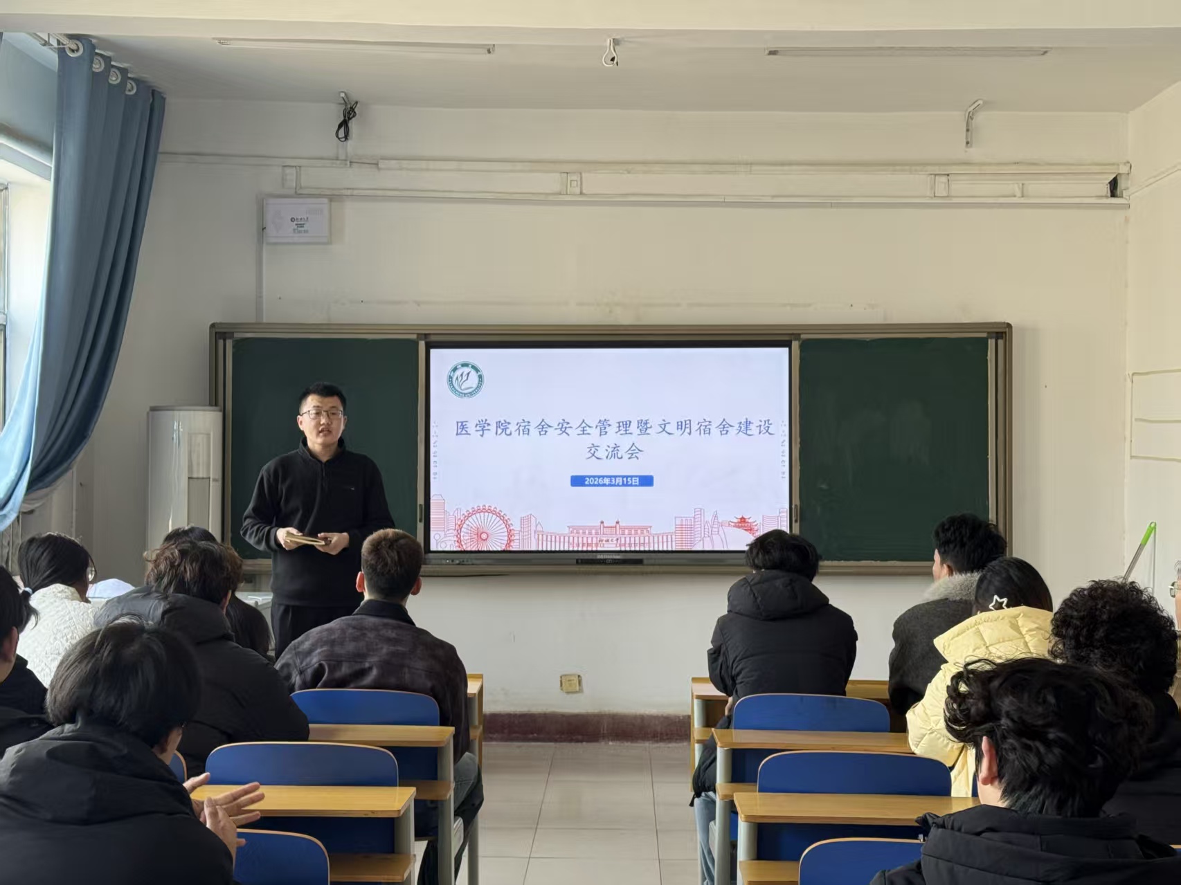 随后,徐志平同学全面解读学校宿舍安全与卫生检查标准,结合日常检查要点,明确安全隐患排查、内务规范整理等关键点,为规范宿舍管理提供清晰指引,强化了参会人员的安全防范与卫生规范意识。