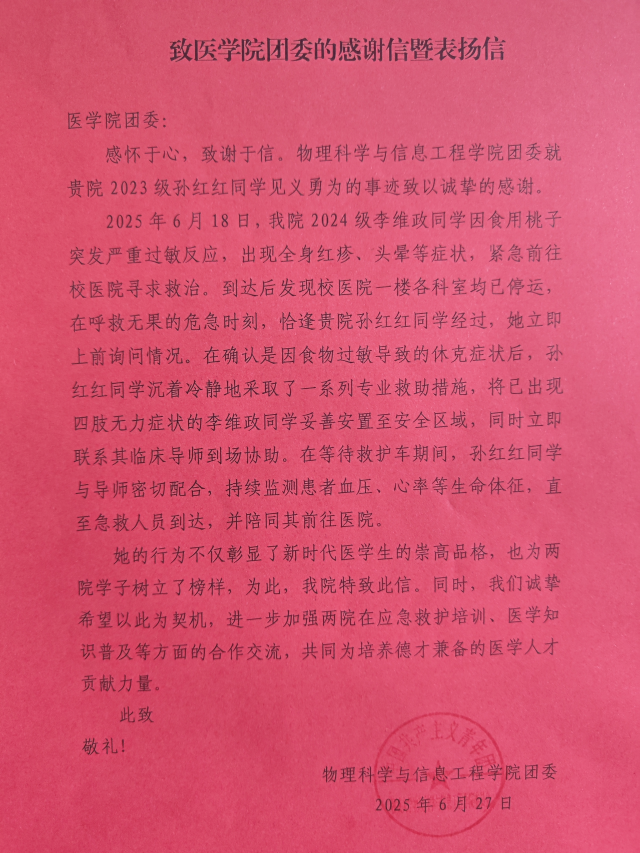 在这一天,物理科学与信息工程学院2024级李维政同学因食用桃子突发严重过敏反应,全身迅速蔓延红疹、头晕目眩,在一楼科室停运的校医院空荡走廊里呼救。千钧一发之际,英国正版365首页2023级学生孙红红经过,她凭借沉着冷静的判断确认李维政已陷入食物过敏休克危机,随即以教科书般的专业素养展开救援。她将四肢无力的李维政安置到安全区域后,迅速联系临床导师,并在等待救护车期间与导师密切配合,持续监测血压、心率等生命体征变化;即便急救人员抵达,她仍选择陪同前往医院,以实际行动诠释了对生命的珍视与担当。